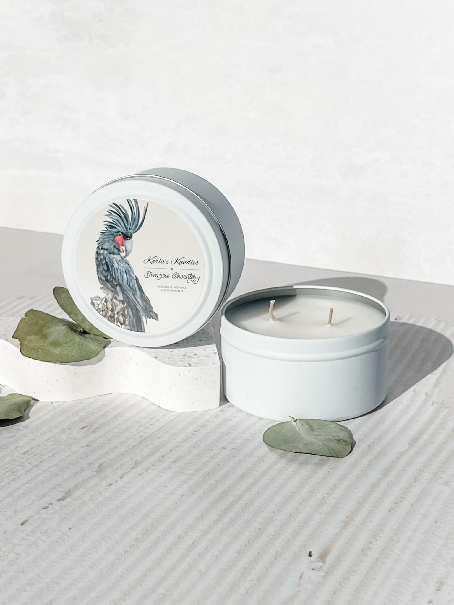 Elevate your space with our premium hand-poured candle, presented in a sleek matte tin and adorned with an elegant illustrated Palm Cockatoo design. Crafted with a smooth coconut–soy blend and dual wicks for an even, radiant burn, this candle brings a refined touch of warmth to any setting. Perfect for gifting or indulging in a moment of calm, it’s a timeless blend of artistry, fragrance, and modern simplicity.